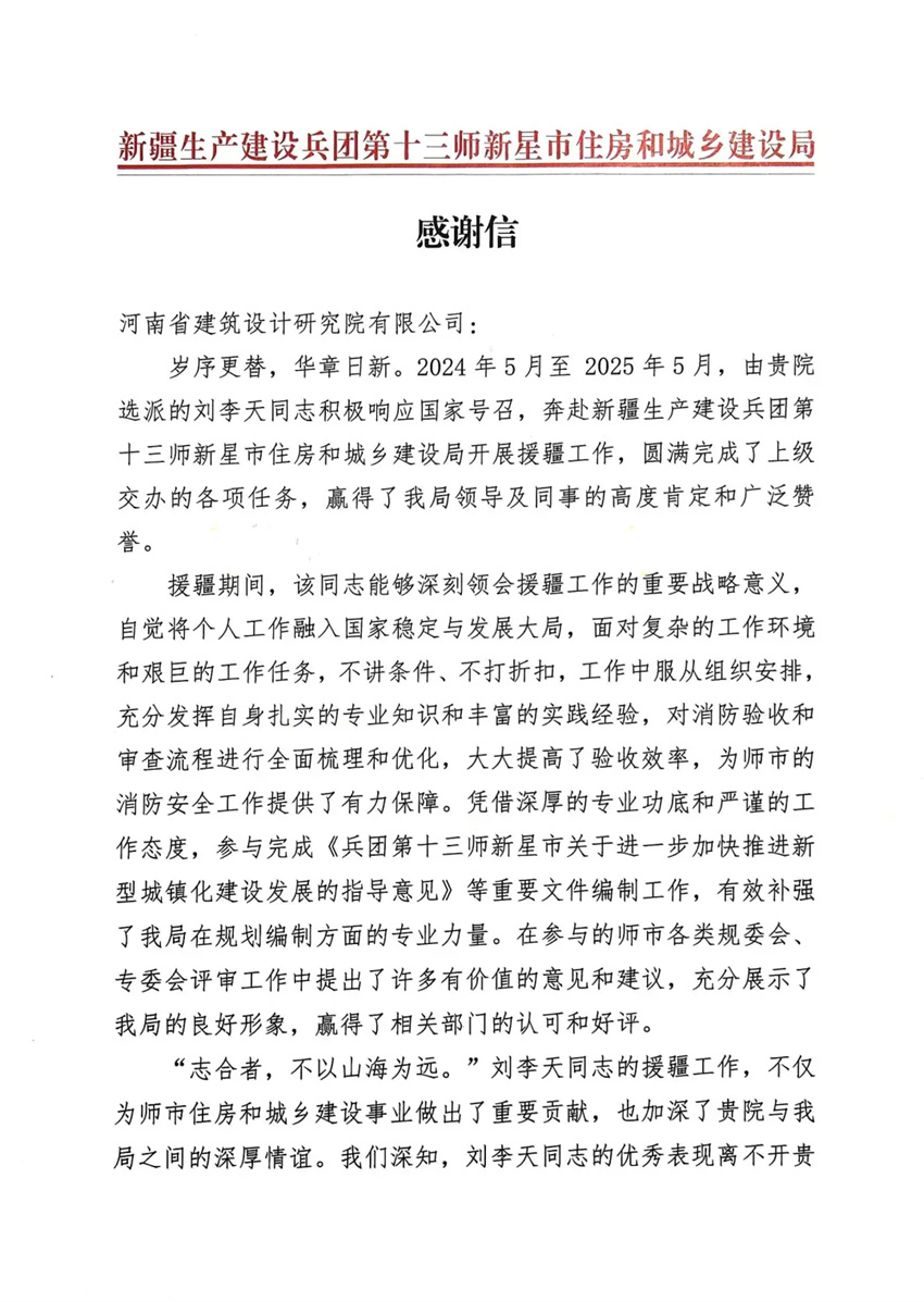 近日,從新疆生產(chǎn)建設兵團第十三師新星市住房和城鄉(xiāng)建設局傳來喜訊,我公司員工劉李天在柔性援疆工作中表現(xiàn)出色,援疆考核被評定為“優(yōu)秀”等次。