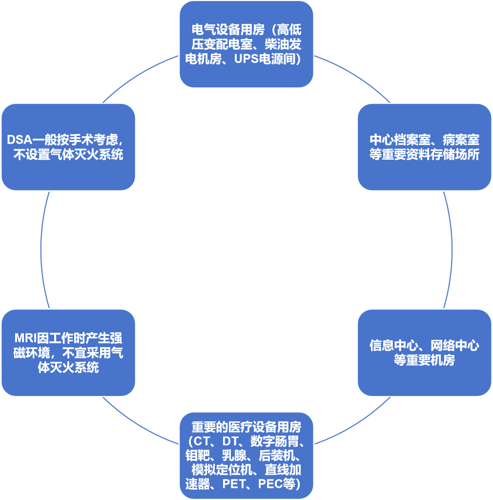 (1)變配電室、網(wǎng)絡(luò)機(jī)房(網(wǎng)絡(luò)中心、信息中心),病案室、檔案室,重要設(shè)備用房(DR、CT、MRI、DSA、PET-CT、SPECT-CT、直線加速器、數(shù)字腸胃機(jī)、鉬靶等),血液病房、手術(shù)室和有創(chuàng)檢查的設(shè)備機(jī)房不應(yīng)設(shè)置自動(dòng)滅火系統(tǒng);