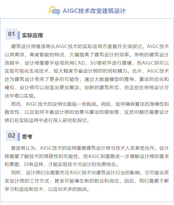 本次分享會從不同維度詳細(xì)地介紹了AIGC技術(shù)在建筑設(shè)計工作中的運(yùn)用,為設(shè)計工作提供了可探討學(xué)習(xí)的方向。在未來的工作中,河南省院將繼續(xù)深入研究和應(yīng)用AIGC技術(shù),努力探索技術(shù)與設(shè)計的最佳結(jié)合點(diǎn)。同時我們也將與更多的同行交流和合作,共同推動建筑設(shè)計行業(yè)的發(fā)展和創(chuàng)新。