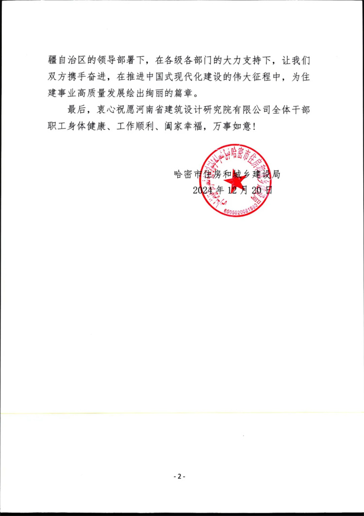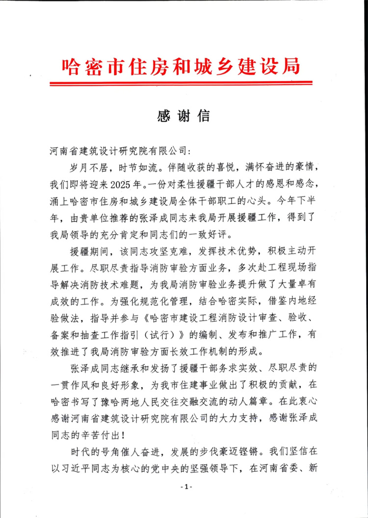 河南省院收到了新疆哈密市住房和城鄉(xiāng)建設(shè)局發(fā)來的感謝信,信中對(duì)河南省院高度重視援疆工作表示衷心感謝,對(duì)河南省院援疆人員張澤成所做出的杰出貢獻(xiàn)給予高度評(píng)價(jià)。