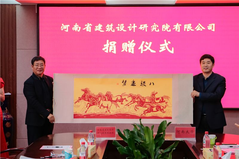 儀式上,河南省建筑設(shè)計研究院有限公司總工程師蔡黎明代表公司簽訂了捐贈協(xié)議,并接受了捐贈證書和紀(jì)念杯;河南大學(xué)土木建筑學(xué)院黨委書記李社教接受捐贈。公司財務(wù)總監(jiān)韓兆海接受了河南大學(xué)土木土木建筑學(xué)院院長岳建偉代表學(xué)校回贈的“八駿追夢”圖。