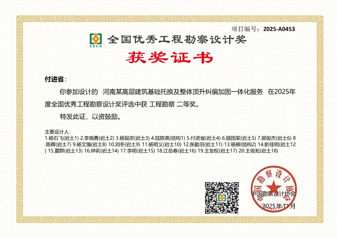 歲聿云暮,華章日新。值此新元肇啟之際,河南省院再傳捷報—由子公司河南省建院勘測設(shè)計有限公司作為主要參與方完成的河南某高層建筑基礎(chǔ)托換及整體頂升糾偏加固項目,榮獲2025年度全國優(yōu)秀工程勘察設(shè)計獎二等獎。