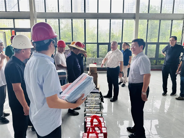 隨后,慰問團(tuán)來到公司新區(qū)辦公樓及配套住宅項(xiàng)目工地。公司黨委書記、董事、財(cái)務(wù)總監(jiān)韓兆海代表公司黨委向一線工人致以親切慰問。他表示:“無論工作還是生活中遇到任何困難,公司都會(huì)全力為大家排憂解難,讓大家安心工作。公司還將根據(jù)氣溫變化靈活調(diào)整施工時(shí)間,避開高溫時(shí)段,在確保安全生產(chǎn)的同時(shí),讓員工更舒適地工作,爭取早日完成項(xiàng)目建設(shè)。”這番話語讓在場工人深受鼓舞,現(xiàn)場響起熱烈掌聲。