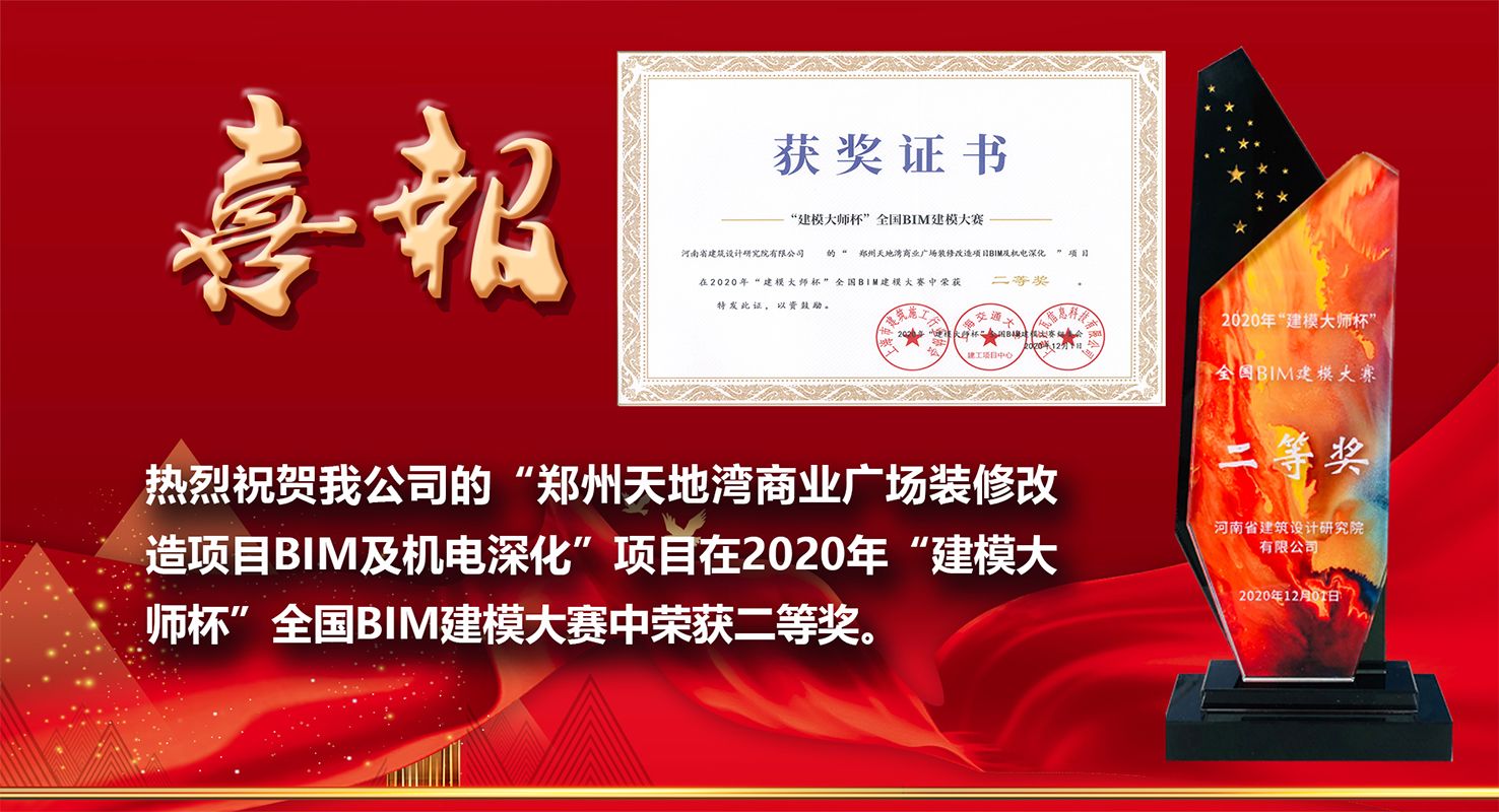 熱烈祝賀我公司的“鄭州天地灣商業(yè)廣場裝修改造項目BIM及機(jī)電深化”項目在2020年“建模大師杯”全國BIM建模大賽中榮獲二等獎