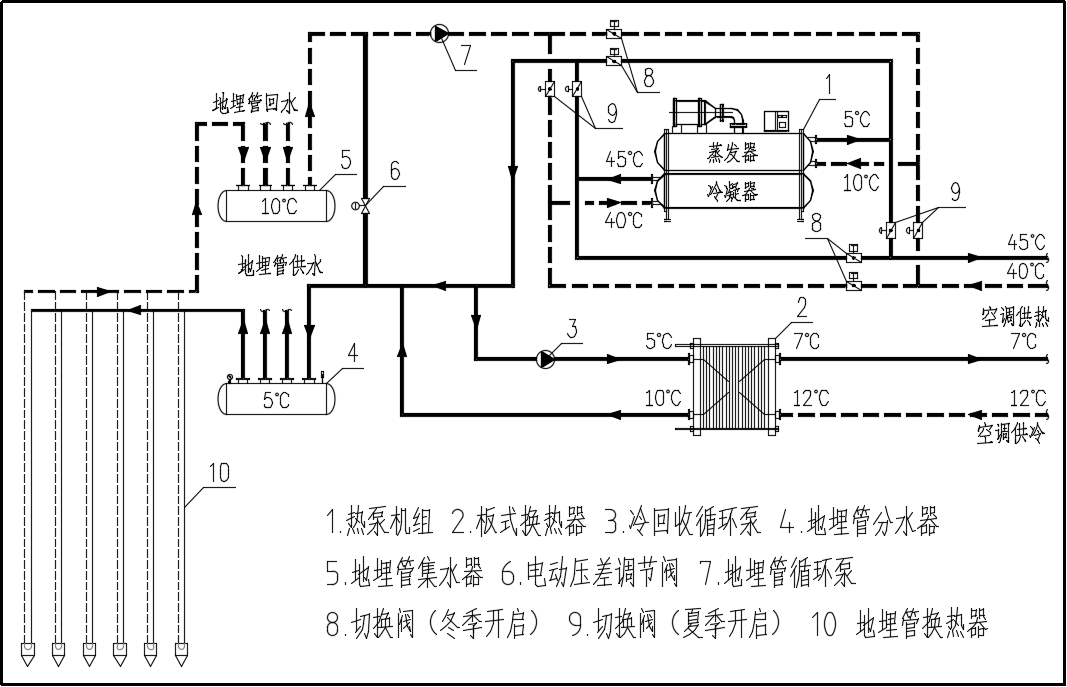 淺層地埋管熱泵系統(tǒng)冬季蒸發(fā)器側(cè)的設(shè)計溫度一般為10/5℃,是非常優(yōu)質(zhì)且穩(wěn)定的冷源。冬季供熱的同時,回收利用這部分冷量,即能減少從土壤中獲取熱量,增大供熱面積,并提高系統(tǒng)效率。