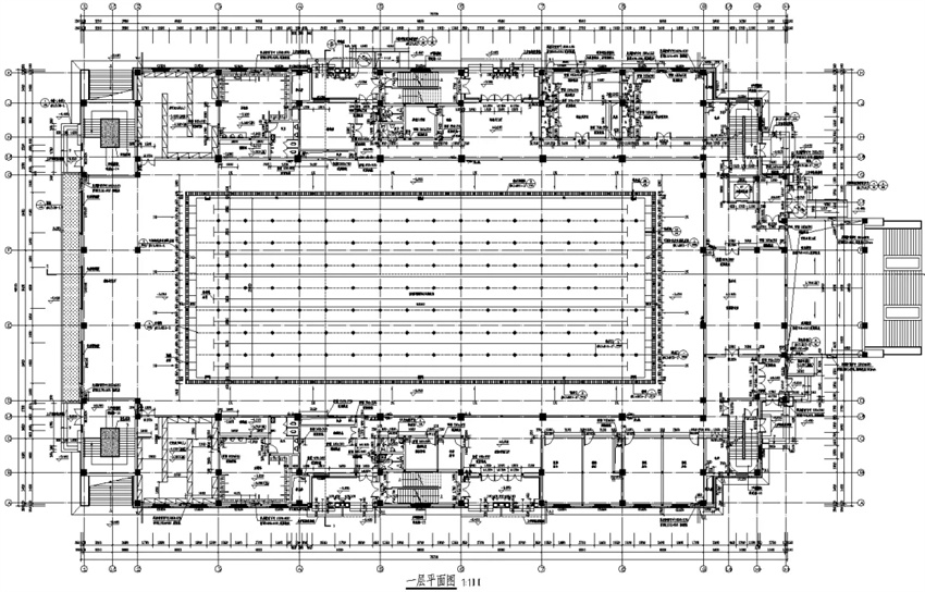 首層游泳池為標(biāo)準(zhǔn)的8賽道50米游泳池,游泳館樓蓋平面尺寸為63mX29.2m,層高8m,兩側(cè)有夾層,層高分別為3m和5m。