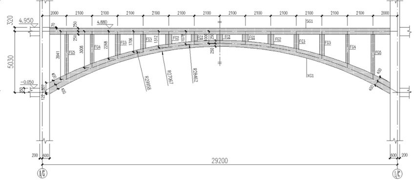 為了能較好解決上述問題,本項(xiàng)目中,借鑒上承式拱橋的結(jié)構(gòu)形態(tài),采用砼空腹拱架梁來實(shí)現(xiàn)29.2m的跨越。砼空腹拱架梁由下弦拱、豎向腹桿和上弦水平梁構(gòu)成,拱腳生根在下層樓層位置。