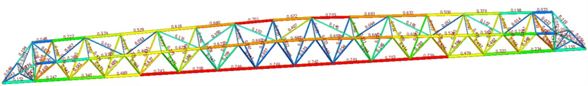 經(jīng)過優(yōu)化比選,最終管桁架上弦桿截面采用φ219X10,下弦桿截面φ245X14,受拉腹桿采用φ121X6,受壓腹桿中部區(qū)域采用φ121X6,兩端區(qū)域采用φ133X8,與支座相連斜腹桿采用φ133X8。桿件驗(yàn)算比均控制在0.8以內(nèi)。