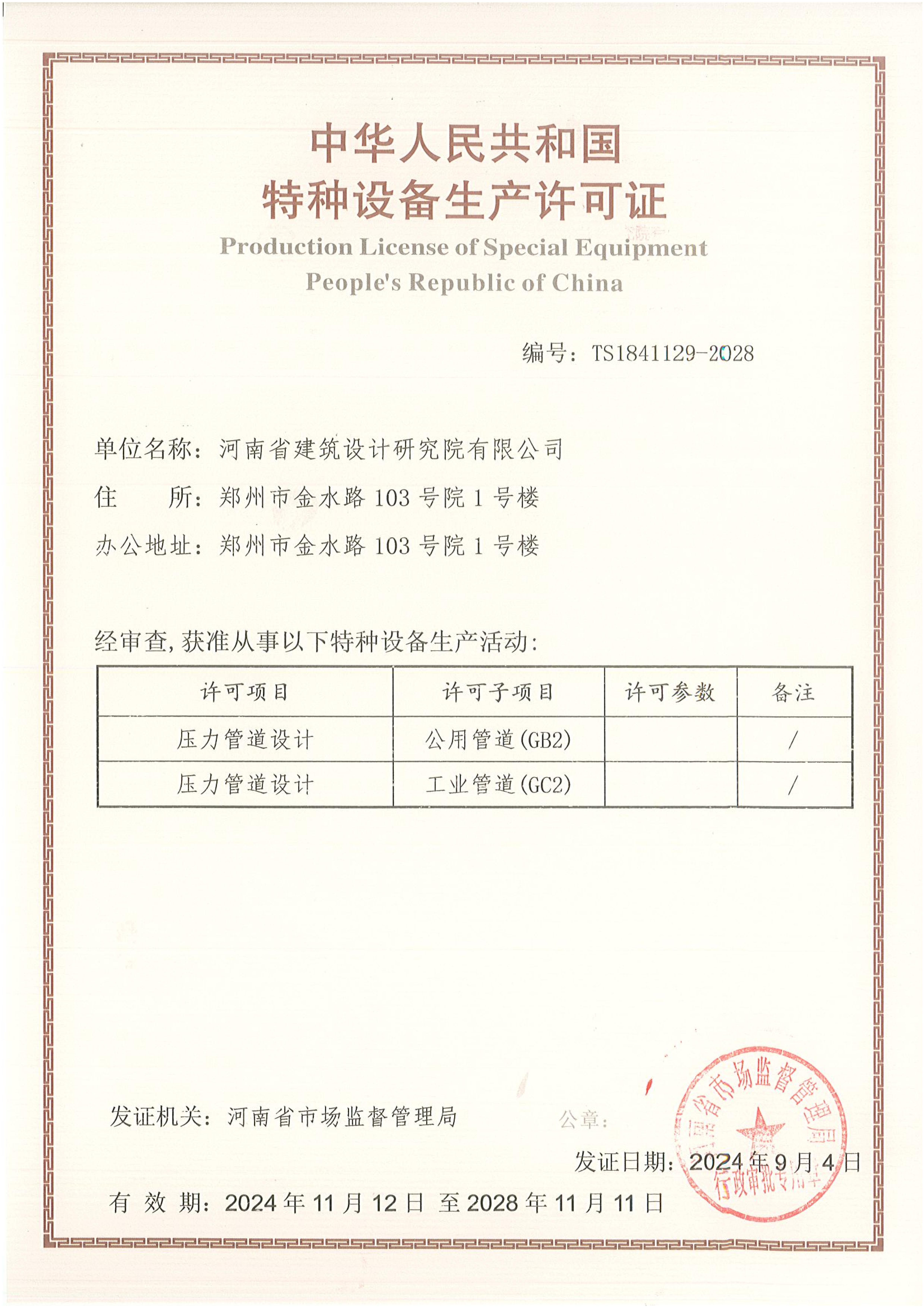 河南省建筑設(shè)計研究院有限公司持有建筑行業(yè)(建筑工程)、市政行業(yè)(道路工程、給水工程)、風(fēng)景園林工程設(shè)計、工程咨詢、造價咨詢、房屋建筑工程監(jiān)理等甲級,市政公用工程監(jiān)理乙級、城鄉(xiāng)規(guī)劃編制甲級、建筑人防乙級、商務(wù)糧乙級,壓力管道設(shè)計等資質(zhì)證書。 河南省建院勘測設(shè)計有限公司持有工程勘察綜合甲級、地基基礎(chǔ)工程專業(yè)承包壹級、乙級測繪等資質(zhì)證書。 河南省建院工程檢測有限公司持有地基基礎(chǔ)工程檢測資質(zhì)證書。 河南省建筑工程施工圖設(shè)計文件審查所有限公司持有施工圖設(shè)計文件審查一類資質(zhì)證書。